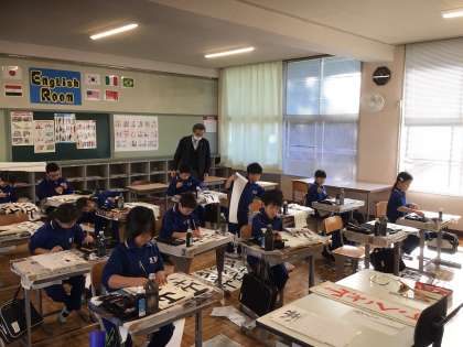 年明けの書き初め大会に向けて、講師の矢舟先生をお迎えし、書写の特別授業を行いました。筆の運び方や文字の形を一つひとつ丁寧に教えていただき、子どもたちは真剣な表情で取り組んでいました。