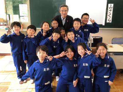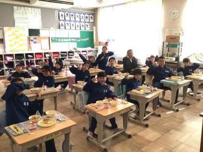 また、給食の時間には矢舟先生と一緒に給食を食べ、和やかな雰囲気の中で楽しく談笑することができました。授業中とはまた違った表情で、子どもたちは嬉しそうに交流していました。