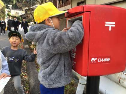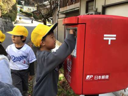 授業中に書いた年賀状をポストへ出しに行きました。自分でポストに入れるのもとても嬉しそうです。無事に届きますように。
