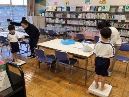 身体測定では、少し緊張しながらも静かに測ってもらう姿が見られました。待っている間は、手洗いの動画を見ながら、楽しそうに手の洗い方をまねして練習していました。