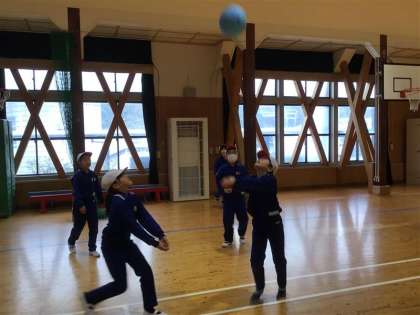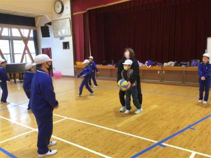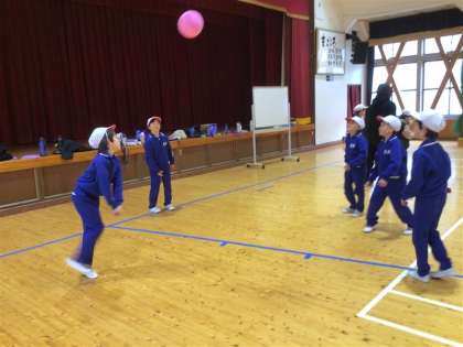 ソフトバレーボールの学習が始まりました。1回目の授業となる今日は、まずはボールに慣れることをめあてに活動しました。最初に、ボールをはじいて相手にパスをする練習を行い、ボールの感触や動きに少しずつ慣れていきました。