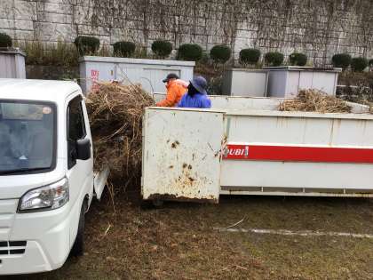6月の環境整備で保護者の方々に刈っていただいた草が伸び、冬になりようやく草刈りができました。校内整備員、公務手、校務支援員の4名で、刈った草をコンテナに積み込む作業を行いました。