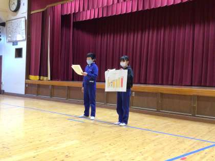 5年生は、洗剤を使いすぎると環境によくないことを経験や数値を交えて発表しました。また、6年生はSDGsの17の目標にある飢餓と海の豊かさについて調べたこと、考えたことをグラフを用いて発表しました。今日の発表を通して、環境を守るために自分たちができることを考える大切さを、全校で共有することができました。