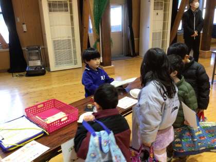 1年生は、小学校での1日を劇を交えて楽しく紹介したり、手作りのおもちゃで一緒に遊んだりして、子ども園の子たちをおもてなししました。