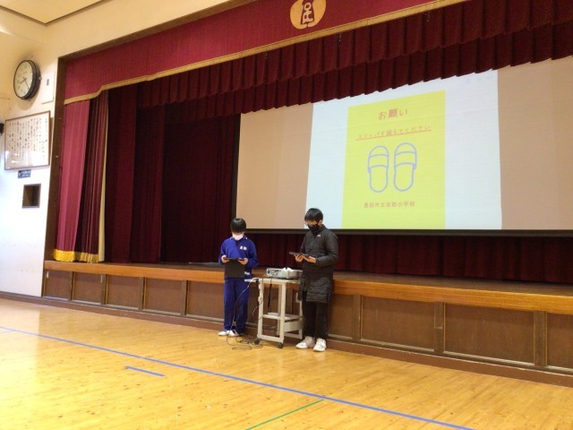 また、保健委員会からは、トイレのスリッパの整頓、流し忘れの防止について、呼びかけがありました。委員会が作ってくれたポスターを、みんなが意識できるようにトイレにはってくれるそうです。昔から「はきものをそろえると 心もそろう」と言われるように、スリッパの乱れは「心の乱れ」や「余裕のなさ」を表しているとされています。次使う人への思いやりの心をもてる「あすっこ」になれるといいですね。