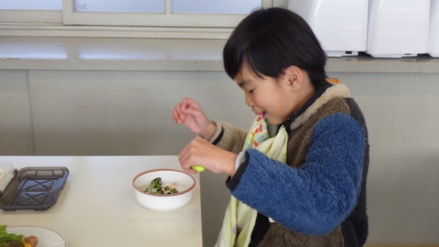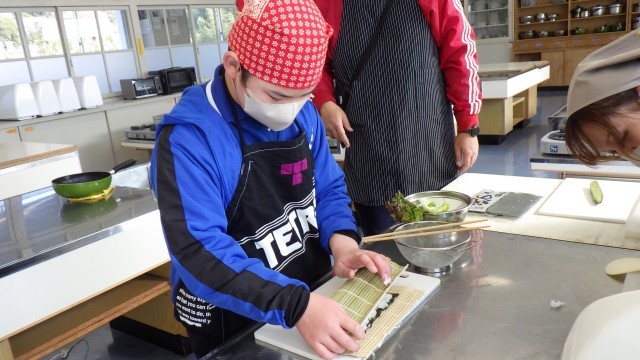 節分の行事を味わうために、みんなで恵方巻づくりに取り組みました。協力しながら具材をのせ、巻く作業にも挑戦しました。完成した一口サイズの恵方巻を、笑顔いっぱいで味わうことができました。