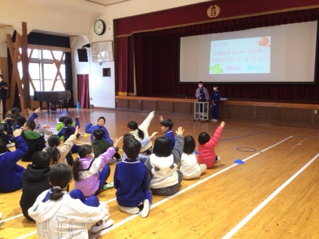 あすっこタイムに給食クイズや残菜調べの結果の発表、休み時間にできる遊びの紹介がありました。保健委員会が今の足助小に必要だと思うことを全校に伝えることで、みんなが意識して生活を送ることができるようになることを目的として行いました。
