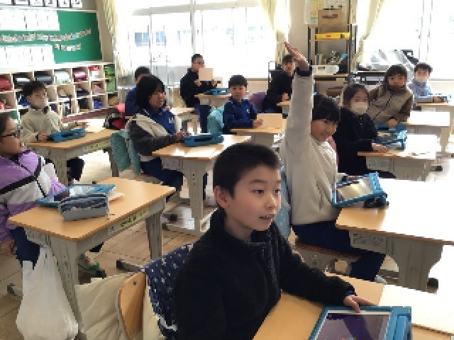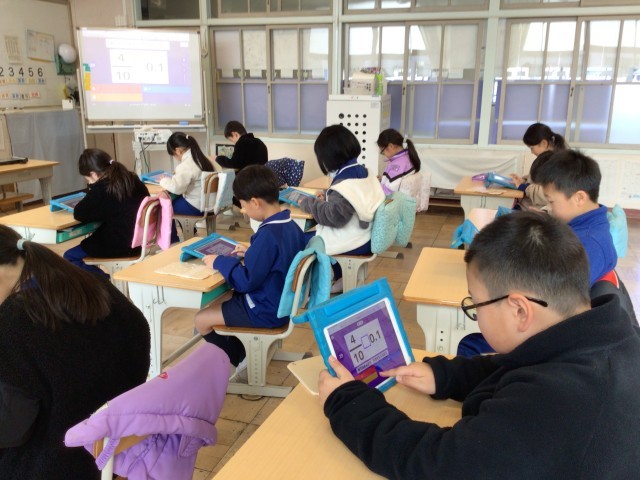 小数の大きさ比べの学習を、アプリを使ってしています。ゲーム形式の問題に、みんな意欲的に取り組んでいます。