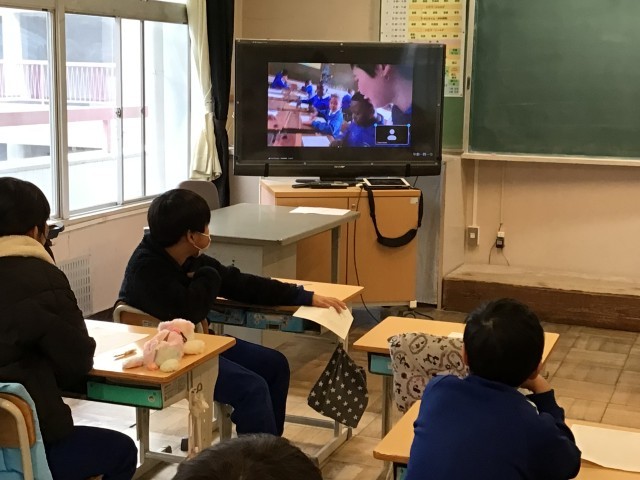 ナミビアの学校とオンライン交流をしました。ナミビアのお昼ご飯のこと、人気のスポーツなどを尋ねたり、ナミビアの子たちからも人気の職業や給食を食べる時間など聞かれました。ナミビアの学校の様子も見せていただき、興味津々の子どもたちでした。