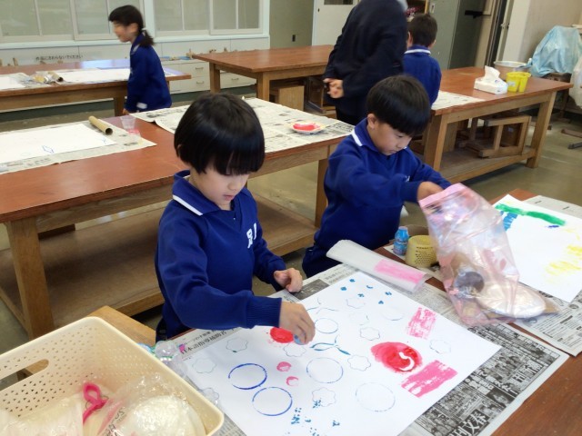 「うつしたかたちから」の単元で、洗濯バサミやラップの芯などの形を使って、模様作りに取り組みました。絵の具の色を選んだり、形をつなげて別の形を作ったり、それぞれの個性が光る作品を作っています。