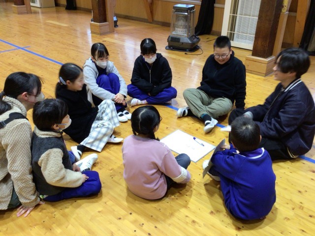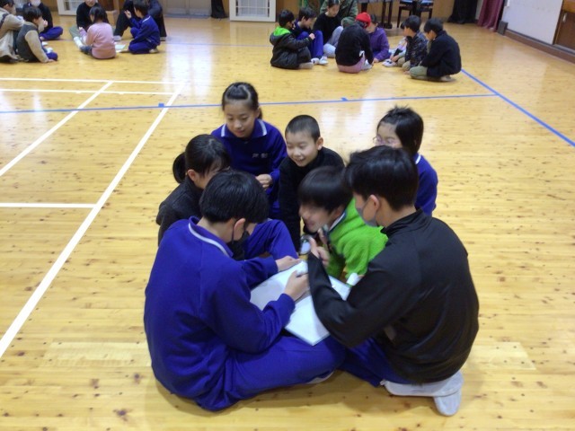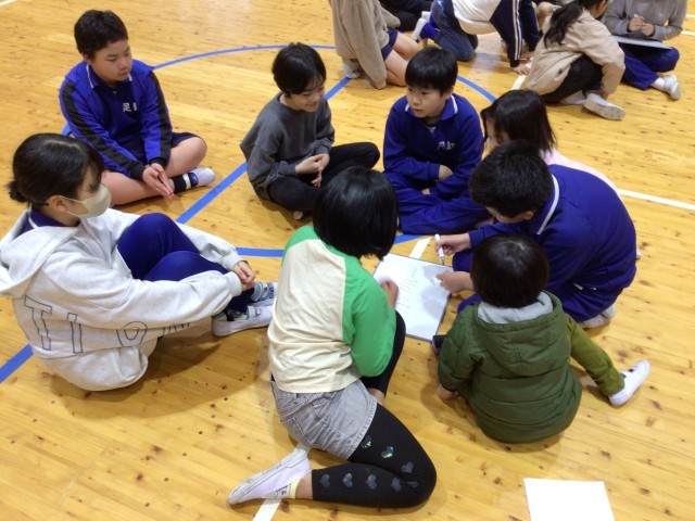 今年度のおしゃべりタイム最終日です。縦割りチームで協力できるゲームを行いました。たけのこニョッキやヒントクイズなど、相手の気持ちを推察したり、会話を楽しんだりしながら、声のボリュームや仲間の声を聞くことを意識する時間になりました。
