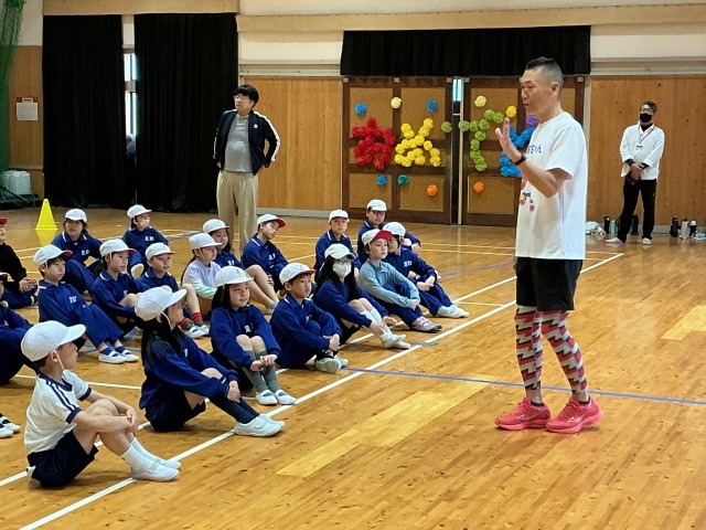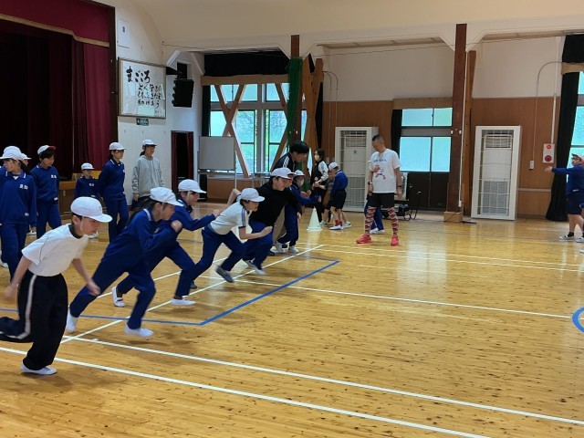 3時間目に、元オリンピック選手の青戸慎司さんを講師に迎え、3~6年生を対象に、走り方教室を行いました。