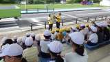 4年生はヘルメットをかぶって自転車に乗り、実際に走ります。夏休み前に交通ルール...