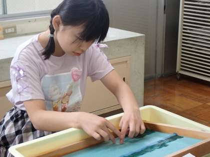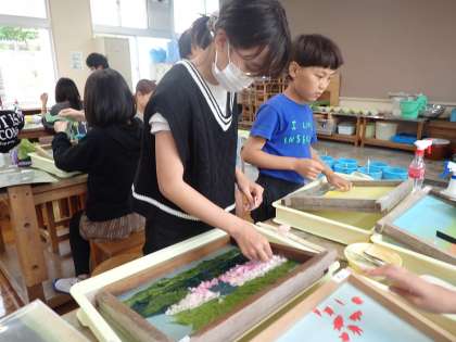 5・6年生:図工「和紙づくり体験」 公開日 2025/06/17 更新日 2025/06/17 お知らせ 図工の授業で、5・6年生が和紙制作をしています。今年のテーマは、「学校のお気に入りの場所」です。タブレットで撮影した写真を見ながら、背景をすいた和紙にパルプや繊維を載せました。自分だけのお気に入りの場所を色鮮やかに表現しています。