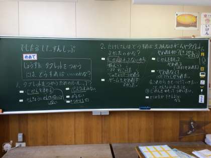 1年生の道徳科で、「上手にタブレットを使うには、どうすればいいのかな?」ということについて考えました。授業の中で、動画資料を視聴してどうすればよかったのか考えた子どもたち。「時間を守ればよかった」「ゲームをやめれないのは、ダメだと思う」などの意見が出ました。これから気をつけていきたいことについて発問すると「時間を守ってタブレットを使いたい」「切り替えができるようにしたい」と発表しました。