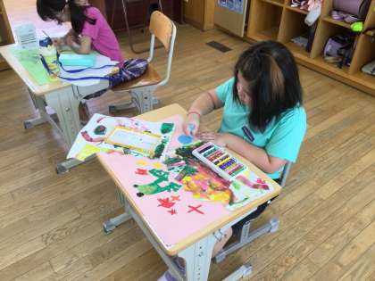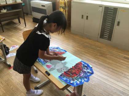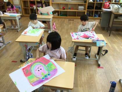 1・2年生:図工「ふしぎなたまご」 公開日 2025/09/04 更新日 2025/09/04 お知らせ 図画工作科「ふしぎなたまご」の学習をしました。だれも見たことのないたまごから、どんなものが生まれてくるのかを想像しながら、絵の具やクレヨンを使って絵を描きました。カラフルな卵からたくさんの生き物や星が飛び出してくるダイナミックな作品が出来上がりました。