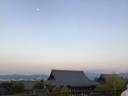 宿の屋上で、西本願寺と京都タワーをバックにぱちり。月も出ていました。