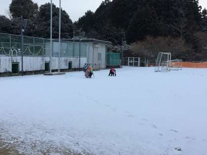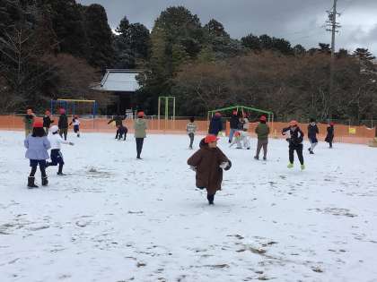 道慈小学校にも降っています。子どもたちは大喜びで、登校のさいは道々雪を集めながら雪だるまを作ったり、道慈っ子タイムには、雪合戦で遊んだりしています。子どもたちはやはり風の子です。