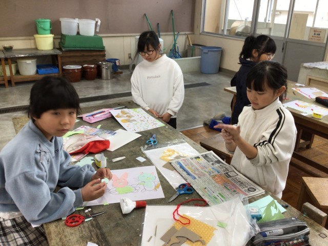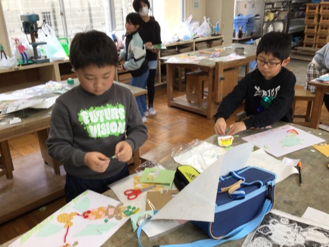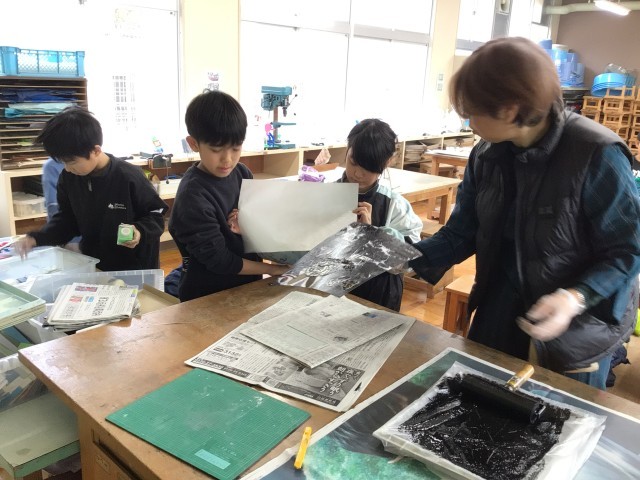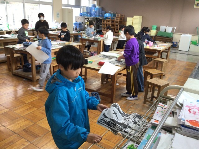 3、4年生は紙版画に取り組んでいます。版を作成するときは、細かな作業ですが、みんな根気良く丁寧に作っていました。版いっぱいに海の生き物や動物が表現されていて、出来上がった作品はどれも力作揃いです。