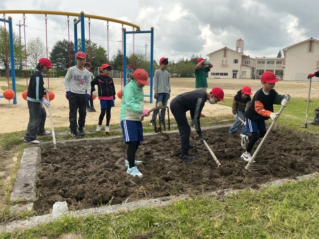 5年生の米作り、今日は田おこしです。くわを持って一生懸命耕していました。「腰が…」「もうやりたくない」と、開始から20分もしないうちに発していました。米作り農家の苦労を感じたようです。
