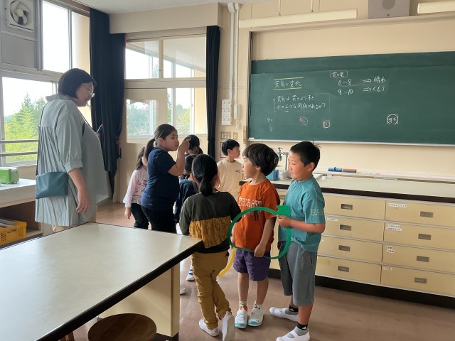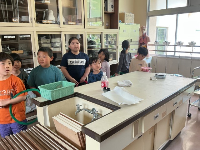 2年生が1年生に学校の案内をしました。音楽室や理科室には興味津々のものがたくさん。2年生の子が「人体模型の名前は、道慈花子さんって言うんだよ」と教えていました。理科準備室にたくさんガイコツがおいてあるのを見て、1年生の子が「ヤバー」と驚いていました。