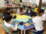 生活科の授業で、校外学習に行って拾ってきたどんぐりを使ってどんぐりごまを作りま...