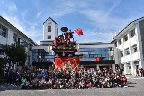 令和5年10月 「挙母祭りを学ぶ会」で、山車が正門から校内に入り、全校で歴史を学ぶ。