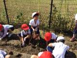 1年生も栽培指導員さんと一緒にサツマイモの収穫をしました。大きなサツマイモが次々に出てきて、みんな目を丸くしていました。明日、みんなで数を数えるそうです。一体何個収穫できたのかな。