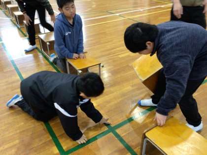 入学式の会場準備。新1年生が座る椅子をそれこそ1mmのずれも許さないくらい、丁寧に一つずつ並べていました。今、自分にできることを、仲間と協力して精一杯やろうとする新6年生の姿に感動しました。