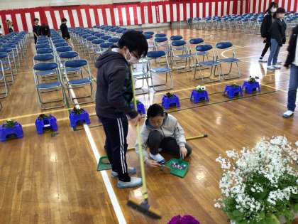 体育館を彩る花を運び終えた後の体育館の入り口は、花びらや花粉がたくさん落ちていました。「ここは新入生が入場するところだよね」そう気付き、考え決めて行動する姿を見ました。準備を終えて見たらゴミが0(ゼロ)でした。