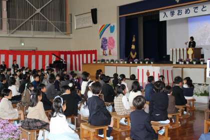 今日は103名のかわいらしい新一年生を迎え、令和6年度がスタートしました。昨夜までの雨がうそのように晴れわたり、澄み切ったすばらしい天気となりました。1年生の子どもたちは、担任の呼名に笑顔で元気よく返事をしていました。そして在校生も進級認定で大きな返事をすることができました。校長先生からは、「あいうえおのカギ」のお話がありました。あいさつのできる子、命を大切にできる子、好きなことに打ち込める子、笑顔で生活できる子、思いやりのある子を目指して、この一年間楽しい学校生活を送りましょう。