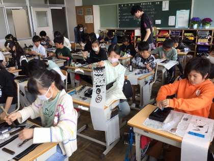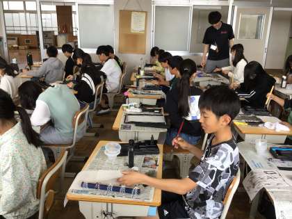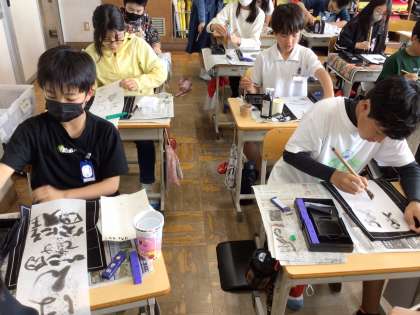 6年生の図画工作科の授業で、「墨と水から広がる世界」という課題に挑戦していました。墨を自分で擦ったり、紙に水垂らしてから描いたりすることで、濃淡を上手に出し、自分の掛け軸を作っていました。墨の濃淡を楽しみながら作った作品は、どれも趣のある素敵な作品ばかりです。ぜひ、お家で飾ってほしいです。