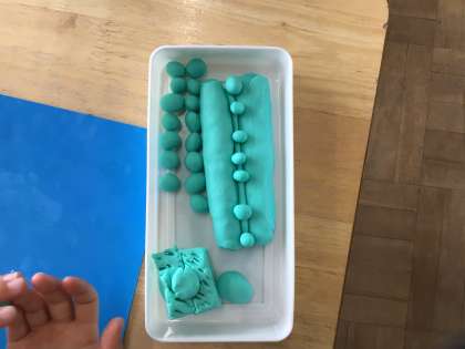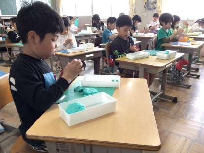 2年生は、油粘土を丸めたり、ちぎったりするときの感触を感じながら、作品を作りました。最初に決めたイメージに近づくように作ったり、粘土をこねているうちに想像を膨らませて作ったり、夢中になって作品を完成させました。