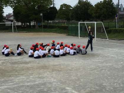 5年生は、ボールを投げたり速く走ったりして体づくり運動をしました。担任の先生からボールを遠くに投げるコツを教わったあと、実際に試して練習をしていました。