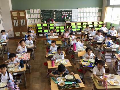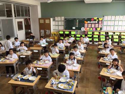 1年生の給食が始まり、1週間がたちました。小学校のルールにも慣れて、美味しそうに食べています。今日のメニューは、肉じゃがに卵焼き。「園の頃よりたくさん食べられるようになったよ」と話してくれる子もいました。心も体も大きくなってきています。