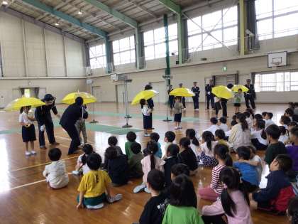 2時間目に、1年生は交通安全教室を行いました。交通安全協会の方や交通指導員の方に来ていただき、横断歩道や線路の渡り方、傘をさしたときの歩き方などを教えていただきました。今日教えていただいたことを生かして、交通安全に気をつけて登下校してくださいね。
