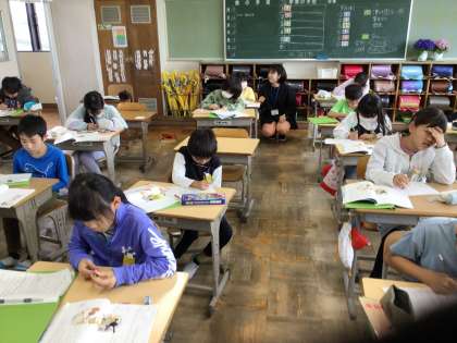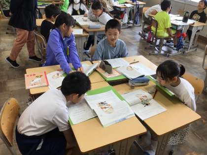 4年生は、国語の授業で「こわれた千の楽器」について学びました。「人物の気持ちとその変化を想像しよう」といった学習課題に対して、チェロ、ハープ、ホルン、トランペットなどの気持ちを想像しました。「チェロは、しょんぼりすねている」という意見に対して、「怒っている」「認めたく無い」など、反対意見が出ました。子どもたちは、、「◯◯さんに付け足して」と友達の意見をしっかり聞いて発言したり、「なぜかというと」と根拠をもって意見を述べたりできました。