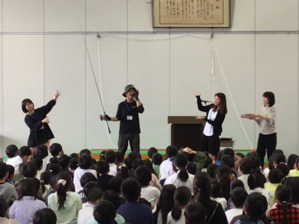 釣り人に扮した4年学年主任の先生が登場すると会場は大盛り上がり。4年生の先生方が釣り竿で1人ずつ釣り上げられ、順に自己紹介をしました。