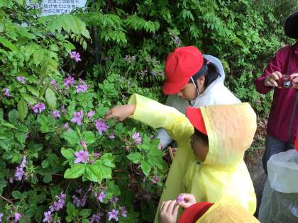 ほんのり甘いモチツツジの蜜を吸ったり、マツの葉を咥えて渋みを感じたりしました。モチツツジのガクが少しべたべたしていたり、マツの葉が渋かったりするのは、虫を花に近寄らせないためであると教えてもらい、植物の知恵を五感で学びました。