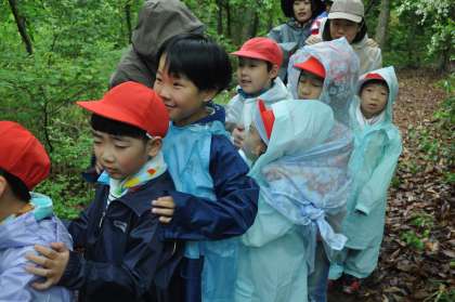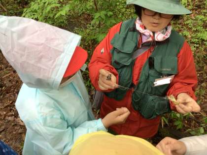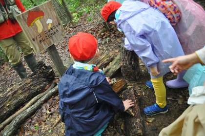 木の根元に生えているきのこは何という名前だろうと、図鑑を取り出して調べたり、落ちていた繭をひっぱってみると糸のようなものが現れたり……。トヨタの森はわくわくで溢れています。