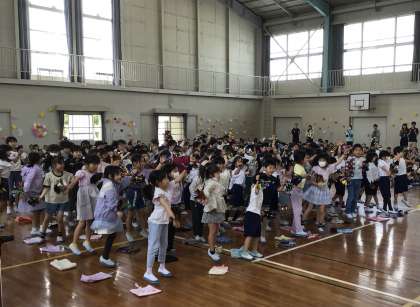 「はじめの言葉」のあとは、各学年の出し物が始まりました。2年生は、ジャンボリミッキーの音楽に乗ってダンスをしました。笑顔で楽しそうに踊る2年生を見て、思わず体が動き出してしまう1年生が微笑ましかったです。