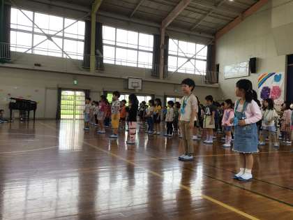 各学年の出し物のあとは、1年生からのお礼がありました。代表の子が話したあと、「こぶたたぬききつねねこ」の音楽に合わせてダンスをしました。かわいらしい1年生を見て、会場全体がほっこりとした気持ちになりました。