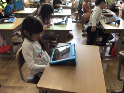 1年生は、教室での学習を始めてから1ヶ月が経ちました。今日は1人ずつ学習用タブレットを受け取り、保管庫からの出し方、しまい方やパスコードの入力の仕方を勉強しました。自分でパスコードを入力して画面が開くと、「できた!」という嬉しそうな声が上がりました。えんぴつでの学習と並行して学習用タブレットも活用して学びを進めていきます。