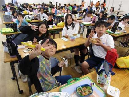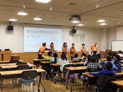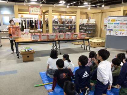 最初に、ごみの分別体験をしました。矢作川に落ちているごみを釣って、そのごみを分別してかごに入れました。「燃やすごみ」のかごには、みんなが釣ったものがたくさん入っていましたが、インプリさんから「正しく分別されていたのは1つだけでした」と言われ、子どもたちは驚いていました。しかし、インプリさんから一つ一つ説明を聞くと、納得でました。プラスチック製容器包装や缶、紙製のお菓子の箱など、再生できるものは思っていたよりもたくさんあるのですね。