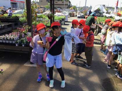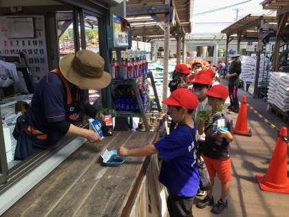 2年生は、夏野菜の苗を買うために近くの大型量販店へ出かけました。事前に購入する苗を決めておき、お金を持って出かけました。売り場に到着すると「これ! 私が買うミニトマトだ!」「とうもろこしの苗見つけた!」など、自分が購入する苗を見つけて喜んでいました。また、「オクラの苗って思ったより大きいな」「こんな小さな苗からいっぱいミニトマトが獲れるのかな?」など、感想や疑問ももっていました。