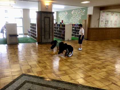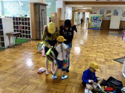 そのような中、下級生をそっと手助けする6年生の姿がありました。また、みんなが教室に上がったあとに、濡れた床をきれいに拭いてくれる子もいました。みんなのため、学校のため、自分で考えて行動してくれる6年生の気持ちが伝わってきて、天気とは裏腹に清々しい朝となりました。