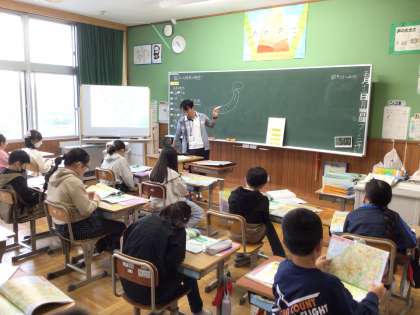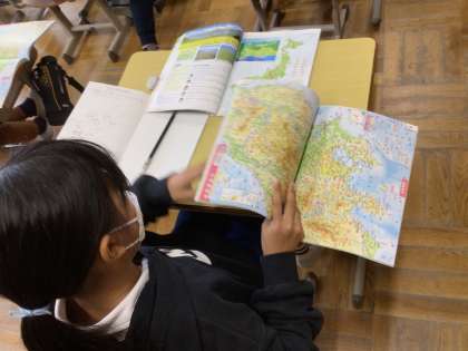 5年生は社会科で国土の地形の特色について学びました。「関東地方は、山地が少なく、低地が多いです」「中部地方は、関東地方に比べて山地が多いです」といった意見がありました。先生から「豊田市はどうかな?」と質問されると、「豊田市は東の方は山地が多い」「童子山学区はどちらかというと低地かな」などの意見が出ました。