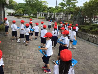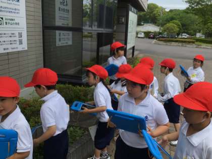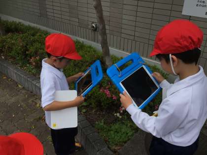 1年生は、見つけたものを話す学習を行うために、校舎の周りや童の森に行って、学習用タブレットを活用してさまざまなものを写真に収めました。「白い花がきれいに咲いていて、これについて話したいな」「童の森で四葉のクローバーを見つけたよ」と楽しそうに話したいものを探しました。
