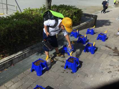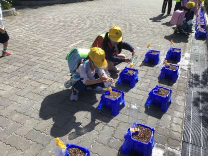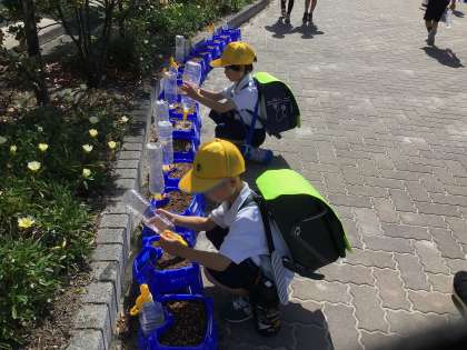1年生は、登校するとすぐに大切なアサガオの水やりを行なっています。「まだ芽が出ていないね」「昨日雨が降っていないからたっぷり水をあげよう」などと、アサガオの前で、友達と会話しながら水をあげています。水やりを通して、子どもたちは自分が育てているアサガオに愛着をもっています。アサガオを育てることで、自然に優しい子どもに育ってほしいと思います。