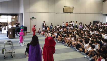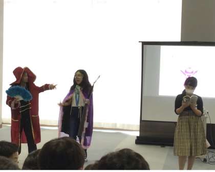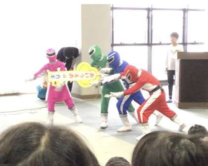 第1回目の今日は、6年生が「わらべンジャー」のショーをやりました。悪の女王たちにやる気を奪われたわらべっ子を、わらべンジャーが「あいうえおの鍵」を使って助けるというストーリーに観客の子たちは大喜びでした。